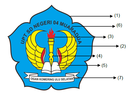- Teks “UPT SD NEGERI 04 MUARADUA” menggunakan huruf kapital standar (tipe Arial bold), berwarna hitam melengkung di atas mengandung makna identitas sekolah dasar yang penuh dengan harapan akan prestasi tinggi.